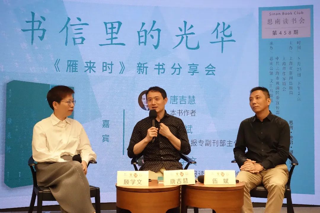从左至右为顾学文、唐吉慧、伍斌 撰稿:陆铭晖 5月25日下午,作家唐吉慧携其最新散文集《雁来时》做客思南读书会第458期,与《解放日报》专副刊部主任伍斌、《解放日报•读书周刊》主编顾学文一同共话书信里的光华。 不容小觑的......