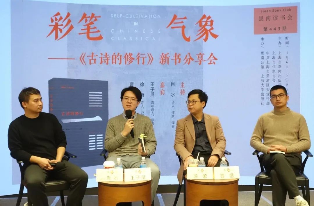 从左至右为肖水、王子瓜、徐萧、曹僧 撰稿:闵佳麟 2024年1月6日,肖水、王子瓜、徐萧、曹僧做客复兴中路505号思南文学之家,共同带来新书《古诗的修行》的分享。这本新书收录了八位当代诗人对八位古代诗人诗篇阅读的心得,当天到......