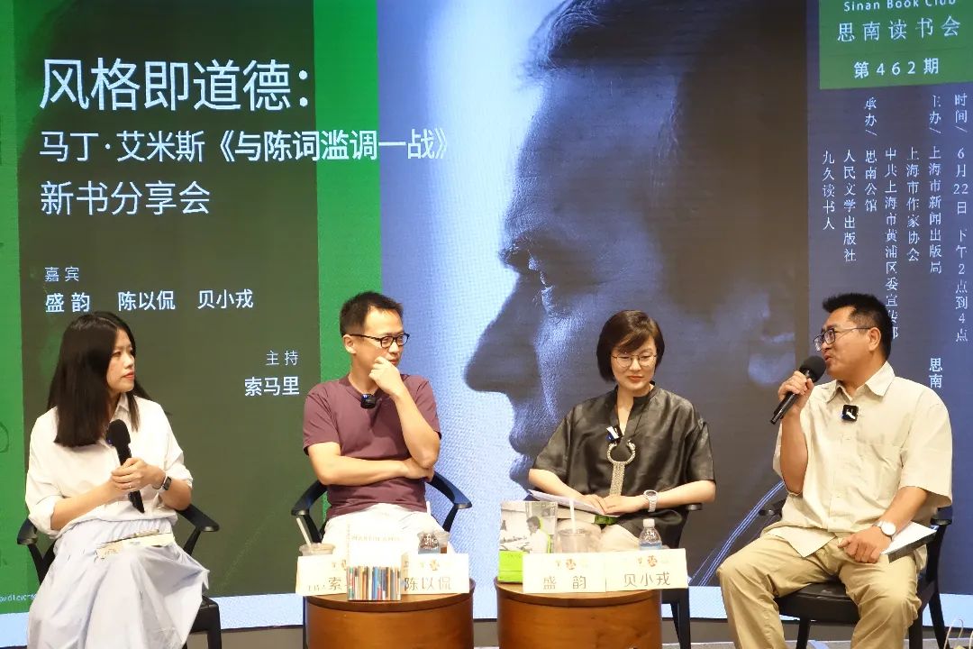 从左至右为索马里、陈以侃、盛韵、贝小戎 撰稿:王瑞琳 6月22日下午,马丁•艾米斯《与陈词滥调一战》一书的译者盛韵,与作家陈以侃、书评人贝小戎、另一译者索马里做客思南读书会地462期,畅谈书评里的文学洞见与写作风格。索马......