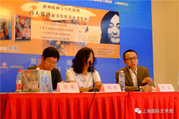 8月16日下午14:30的“酒神精神与当代涂鸦”读者见面会,嘉宾有韩博、胡桑、叶文。