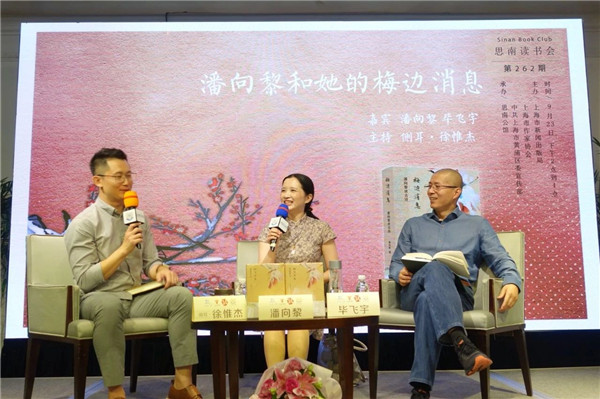 9月23日下午,潘向黎携其新书《梅边消息:潘向黎读古诗》,与小说家毕飞宇、SMG主播徐惟杰作客第262期思南读书会,共同品茶谈诗,在古典风景里触摸现代人的心跳和脉搏。
